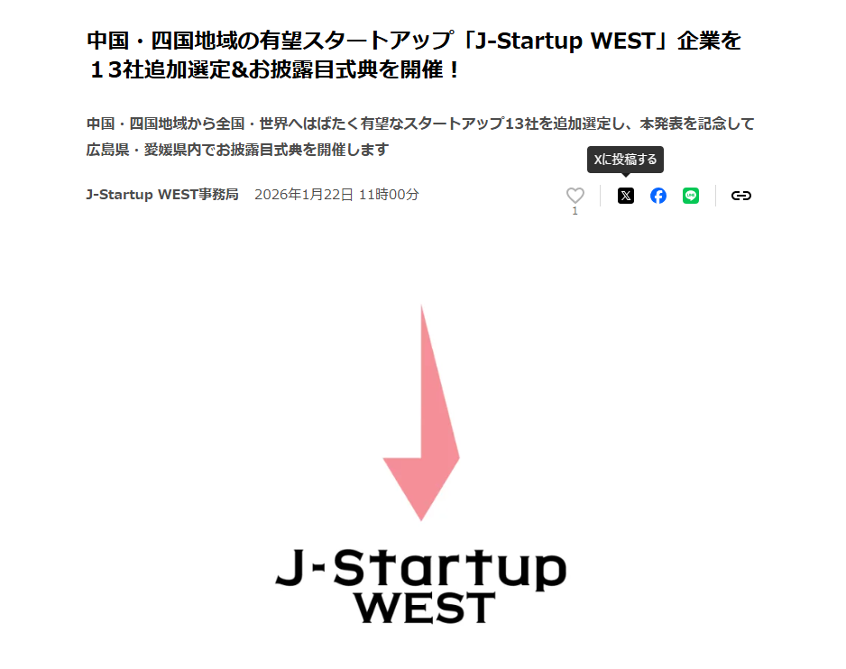 今回の選定により、今後は「J-Startup WESTサポーターズ」による官民一体となった集中的な支援(展示会出展支援、マッチング、PR支援等)を受けることが可能となり、